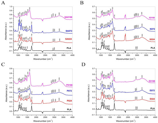 Fourier Transform Infrared (FTIR) Spectroscopy images of biofilm cultivated for 24 h, 72 h and 168 h on the PLA surface. (A) = Staphylococcus aureus (SA) biofilm at 24 h (SA024), 72 h (SA072) and 168 h (SA0168). (B) = Klebsiella pneumoniae (K) biofilm at 24 h (K024), 72 h (K72) and 168 h (K0168). (C) = Pseudomonas aeruginosa (P) biofilm at 24 h (P024), 72 h (P072) and 168 h (P0168). (D) = Enterococcus faecalis (E) biofilm at 24 h (E024), 72 h (E072) and 168 h (E0168). The strains used were Staphylococcus aureus ATCC 25923, Enterococcus faecalis ATCC 29212, Klebsiella pneumoniae ATCC 13883 and Pseudomonas aeruginosa ATCC 27853.
