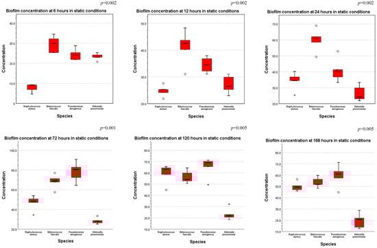 Comparison of biofilm concentration across all species tested in static conditions, at 6 h-12 h-24 h-72 h-120 h-168 h (ANOVA test performed—p-values displayed).