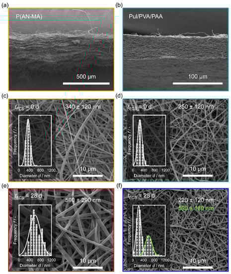SEM images of P(AN-MA) and Pul/PVA/PAA nanofiber mats showing cross-sections (a,b) and top views before (c,d) and after 28 days of culture conditions in FCS (e,f). The insets in (c–f) show histograms of the nanofiber diameters. Inset (f) shows a bimodal fiber distribution after 28 days of incubation caused by attaching fibers (green).