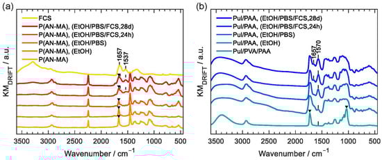 Pul/PVA/PAA nanofiber mats were also investigated with DRIFT infrared, Figure 3b. A significant change after washing with 80% EtOH was observed since two peaks at 1730 cm−1 and 1034 cm−1 are missing (Pul/PVA/PAA, (EtOH)). These peaks are characteristic for PVA, namely the (C=O) stretching vibration of acetate groups from partially hydrolyzed poly(vinyl acetate) [] and the (C-O) stretching vibrations of PVA. This indicates that the water-soluble sacrificial PVA had been removed during EtOH sterilization. After washing with PBS, the peak at 1570 cm−1 became more intense (Pul/PAA, (EtOH/PBS)). This is due to stretching vibrations of carboxylate groups (C=O) that are generated by the deprotonation of carboxylic acid groups. In turn, the characteristic broad band O-H stretching vibration between 3300 and 2500 cm−1 [] of the free carboxylic acid group is depleting. After treatment with FCS for 24 h (Pul/PAA, (EtOH/PBS/FCS, 24 h)) and 28 d respectively (Pul/PAA, (EtOH/PBS/FCS, 28 d)), an additional peak at 1657 cm−1 indicated the presence of FCS components (amide I). The amide II vibrations were hidden by the strong C=O stretching vibration at 1570 cm−1. The characteristic FCS peaks in the Pul/PAA scaffolds were less pronounced than in the P(AN-MA) scaffolds, which means that less FCS was adsorbed. This is consistent with the SEM observations, where significant swelling was only observed in the case of P(AN-MA). A possible reason could be the thermal crosslinking reaction, which is required to render Pul/PAA water stable. The resulting chemically cross-linked polymer network will impede the intercalation through individual FCS components while the van der Waals bound segmented P(AN-MA) polymer chains could facilitate the uptake of FCS components into the intra polymer chain space like plasticizers.