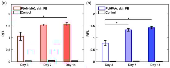 Metabolic assay of skin FBs (n = 3) growing on electrospun nanofiber mats for 14 days analyzed by PrestoBlue HS Cell Viability Assay and control (electrospun nanofiber mats without cells). The mean of the fluorescence intensity shown as RFU of three scaffolds per condition with three measurements per sample were examined. Significant proliferation was found from day 3 to 14 on P(AN-MA) (a) and from day 3 to 7 and 14 for Pul/PAA (b). Significance p < 0.05 (*).