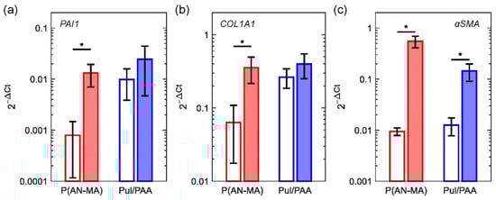 Thirdly, TGFβ stimulation led to an up-regulation of the pro-fibrotic genes PAI1, COL1A1, and αSMA (Figure 5), which is an important and standard functionality test of skin FBs []. This effect was more pronounced with the P(AN-MA) scaffolds compared to Pul/PAA. Interestingly, the basal gene expression levels of PAI1 and COL1A1 of cells in Pul/PAA nanofiber mats was similar to TGFβ-treated samples and as high as the TGFβ-stimulated P(AN-MA) samples. This demonstrates a lack of TGFβ-responsiveness of cells in Pul/PAA nanofiber mats, which might not be an ideal material for the development of a skin model.