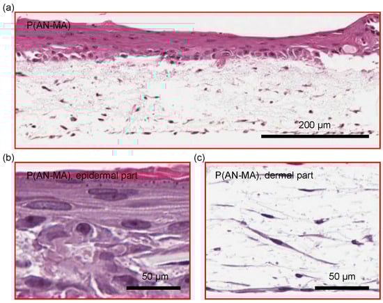 Our subsequent investigations on P(AN-MA) scaffolds demonstrated suitable skin FBs infiltration into the nanofiber network, with the generation of a dermal structure. Once populated with keratinocytes, formation of an epidermal-like structure was confirmed, which was similar to a previous study where we used a bioprinting approach [].