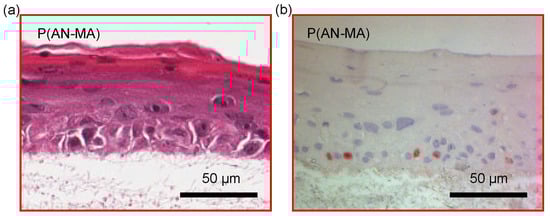 Primary keratinocytes cultured on top of skin FBs grown in P(AN-MA) nanofiber mats formed a stratified epidermal-like structure as shown with H/E staining in Figure 8a. In Figure 8b, sections of the epidermal part were stained with Ki-67 to visualize proliferative cells (red). Only in the lower epidermal layer Ki-67-positive cells were found (Figure 8b).