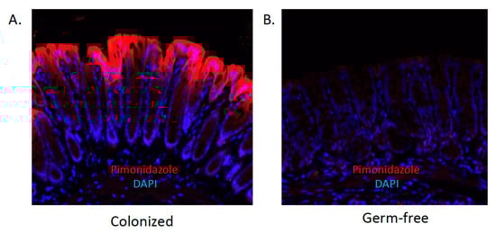 Tissue oxygenation has been observed using 2-nitroimidazole dyes (e.g., pimonidazole), a class of compounds known to undergo intracellular metabolism dependent on the level of tissue oxygenation [] (Figure 1). These dyes were developed to image the low-oxygen environment of growing tumors [] and have subsequently been used as tools to monitor levels of tissue oxygenation ex vivo. Nitroimidazoles can form covalent bonds with thiol groups of various tissue macromolecules only at a pO2 < 10 mmHg. Antibodies specific for these conjugated adducts provide a histochemical approach to estimation of tissue pO2. It is notable that this approach has not been established to titer tissue pO2; rather it is a qualitative estimate of tissue hypoxia (e.g., above or below pO2 of ~10 mmHg). In addition, studies in germ-free mice have revealed that such physiologic hypoxia results in large part to contributions from the microbiota [] (see Figure 1).
