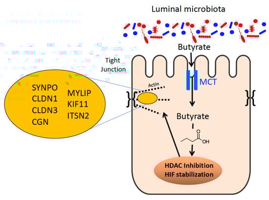 Multiple studies have shown that the selective sequestration of butyrate in the colon influences intestinal barrier function. For instance, an mRNA-based screen of intestinal epithelial cells exposed to physiologic concentrations of butyrate revealed the repression of claudin-2 (CLDN2), a “leaky” claudin that increases permeability. The mechanisms of butyrate activity were subsequently traced to induction of the IL-10 receptor (IL-10Rα) and IL-10-enhanced protein expression on IECs through HDAC inhibition []. Other studies have shown butyrate to induce the expression of “sealing” TJ proteins such as CLDN1, also through HDAC inhibition []. More recently, a newly characterized gene of interest to barrier function, synaptopodin (SYNPO) was identified via a single-cell RNA sequencing approach (scRNAseq). SYNPO is an important intestinal epithelial tight junction protein. Like claudins, the mechanisms of butyrate regulation of SYNPO were via HDAC inhibition (Figure 2). SYNPO was additionally shown to promote wound healing as an important component of the butyrate-derived wound healing response in vivo []. Altogether, butyrate can coordinate the repression of a “leaky” TJ protein, the induction of “sealing” TJ proteins, and coordination of wound healing responses through HDAC inhibition. While HDAC inhibition impacts the expression of ~2% of mammalian genes [], butyrate regulates barrier function by targeting multiple genes through HDAC inhibition. Additionally, SYNPO was induced at the protein level after 6 h of butyrate treatment, while other studies showed that CLDN2 levels were reduced by butyrate after 24 h, which corresponded with peak IL-10Rα induction at 24 h, followed by a CLDN1 increase after 36 h [,]. The observations suggest that butyrate may temporally orchestrate the induction and repression of specific TJ proteins to ultimately promote barrier function. Wang et al. showed in their scRNAseq that multiple TJ and actin-associated genes were upregulated by butyrate including cingulin (CGN), CLDN1, CLDN3, as well as genes related to cellular motility including MYLIP and KIF11 [] (Figure 2). This suggests that butyrate simultaneously and purposefully influences multiple genes related to these processes as, naturally, the AJC is comprised of many components and active epithelial restitution to begin wound healing requires many proteins working in concert.