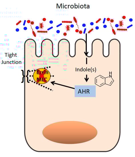 Microbe-derived indole regulates epithelial tight junction function. Indoles act through the aryl hydrocarbon receptor (AHR) to inhibit ezrin and myosin light-chain (MLC) kinase activity.