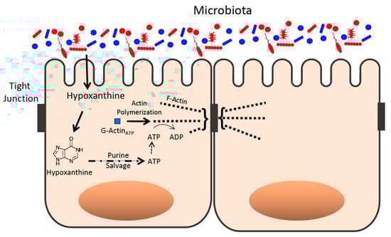 Purines derived from microbial sources influence the epithelial apical tight junction actin complex. Purines such as hypoxanthine are derived, in part, from microbial sources and are salvaged as templates for ATP generation that supports actin polymerization of G-actin to F-actin in the apical epithelial TJ complex.