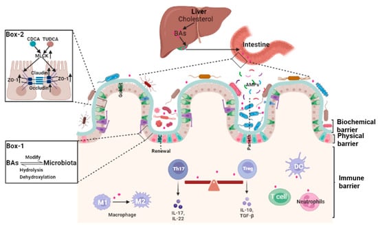 A well-functioning intestinal barrier maintains normal function of the digestive tract and positively impacts the entire individual. This is not surprising as the intestinal barrier is the largest interface between the individual and the environment. It is sensitive to changes in many external and internal factors such as diet, pollution, alcohol, drugs, stress, and life cycle [,,]. Bile acids are the only small molecules synthesized de novo and metabolized by the digestive system. Bile acids traverse the enterohepatic circulation 6–8 times per day and have a complex dynamic interaction with the gut microbiota []. It is reasonable to ascribe a central role to bile acids in intestinal homeostasis.