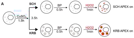 After induction cells were incubated in Schneider’s or KRB for 4 h. To induce APEX activity, 500 uM biotin-phenol was added to the medium in the last 0.5 h, and 1 mM H2O2 was added for 1 min just before harvesting. Biotinylation reaction was quenched with 5 mM Trolox and 10 mM solidum L-ascorbate in PBS. After cold-PBS wash, cells were harvested by scrapping and lysed in ice-cold lysis buffer (8 M urea, 150 mM NaCl, 20 mM Tris-HCl pH 8.0, Protease Inhibitor Cocktail, 5 mM Trolox and 10 mM sodium L-ascorbate) for 30 min on ice. Lysates were cleared at 18,000× g for 30 min at 4 °C and the protein concentration was determined with a BCA protein assay kit (Thermo Fisher Scientific, Waltham, MA, USA). 50 uL streptavidin-coated magnetic beads (Thermo Fisher Scientific, Waltham, MA, USA) were incubated for pulldown experiments with 380 ug protein for each condition with end-to-end rotation for 2 h at room temperature.