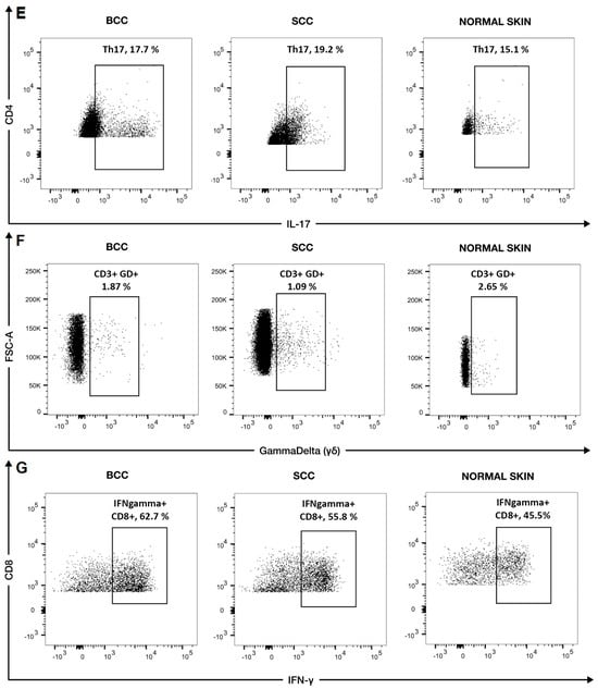 Flow cytometry charts from one representative BCC, one SCC, and one NS sample. In the dot plots, percentages denote the frequency of events/cells within selected regions relative to the total depicted events. Shown are percentages of (A) CD4+ and CD8+ cells within CD3+ cells, (B) CD45RO+ cells within the CD3+ population, (C) IFN-γ+ cells within the CD4+ population (Th1 cells), (D) IL-4+ cells within the CD4+ population (Th2 cells), and (E) IL-17+ cells within the CD4+ population (Th17 cells). In (F), the graphs depict the combined forward scatter plot (FSC-A) of lymphocytes, featuring the expected dispersion of cell sizes (y axis) and concurrent staining for the TCR γδ (GD). The lymphocyte population was gated from a prior compound scatter plot (forward plus side scattering). Also shown are the percentages of IFN-γ+ cells within the CD8+ population (G). In the graphs, y and x axes depict the logarithm of relative fluorescence intensities.
