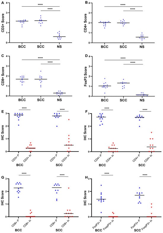 We subsequently analyzed the scores for CD3+, CD4+, CD8+, and FoxP3+ cells localizing either at the inner area of the tumor (In area) or at the tumor periphery (P area) (see the Materials and Methods section for details). In both SCCs and BCCs, the median scores for these populations were consistently higher for the P area than for the In area (Table 4; Figure 3E–H and Figure 4). BCCs and SCCs featured identical scores when compared at the In area and the P area (Table 4; Figure 3E–H).
