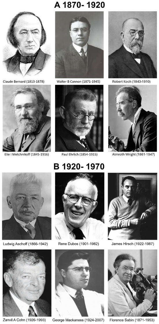 During the mid-19th century, Charles Darwin laid the groundwork for his theory of the origin of species and for natural selection as the driver of evolution [1]. Before the first Nobel awards, Rudolph Virchow had already put forward a cell-based theory of health and disease [2,3], soon followed by the stunning achievements of Louis Pasteur in chemistry, microbiology, and vaccinations [4]. Also in the later 19th century, Claude Bernard became a major influence in physiology and experimental medicine through his concept of the stable “milieu interieur” [5], later termed Hom(e)ostasis by Walter Cannon [6]. These and other investigators influenced the thinking of Metchnikoff, a zoologist interested in embryology before his conversion to ”natural immunity” and comparative pathology [7]; Metchnikoff and Ehrlich shared Nobel awards in 1908 for their contributions to cellular and humoral immunity [8,9,10,11,12,13,14]. Other Nobel laureates in the early decades of the 20th century included the following (Table 1 and Figure 2):
