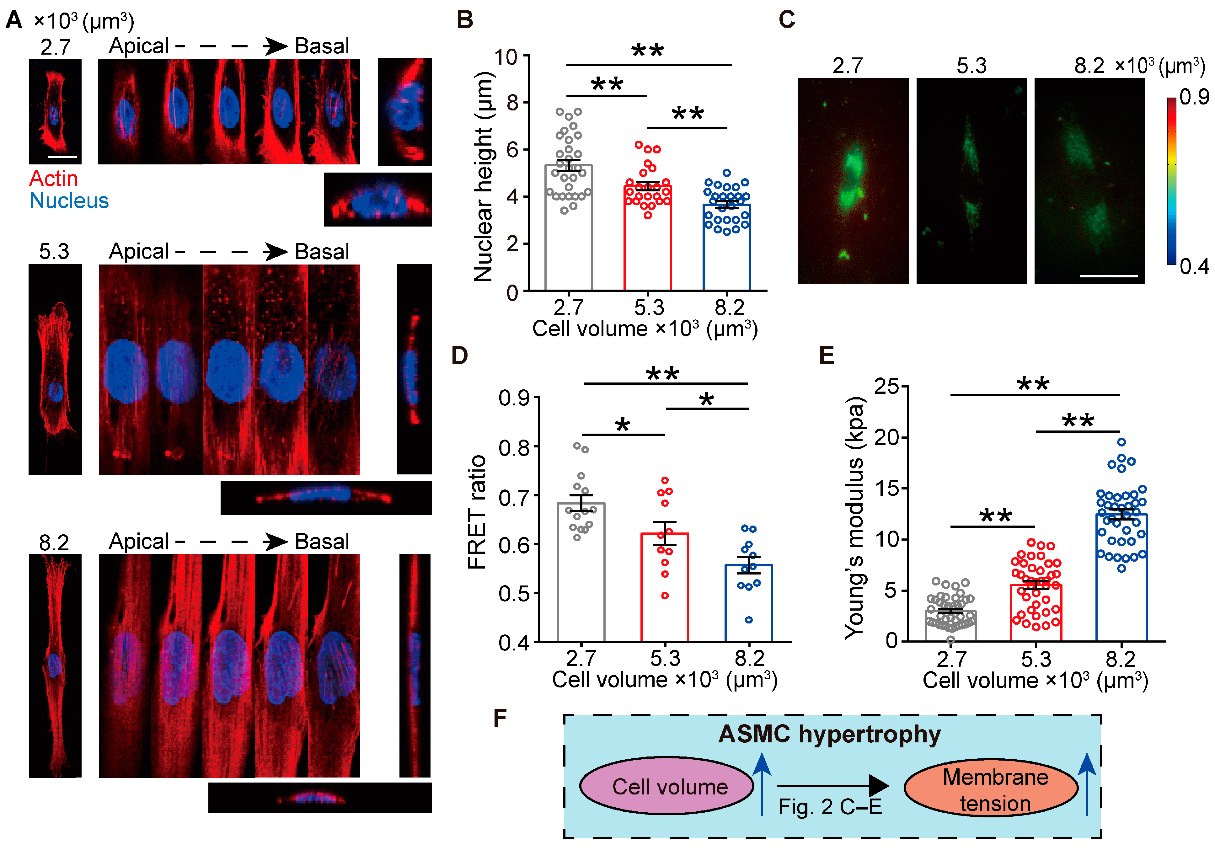 3.2. Cell Volume Regulates Perinuclear Cytoskeleton Organization and Membrane Tension of ASMCs