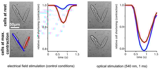 Application example of Channelrhodopsin 2 (ChR2). Isolated cardiac myocytes from a mouse with cardiac expression of ChR2 show contraction after being electrically paced (left) and light stimulated (right). The colored graphs present the cell length of two individual cells as indicated in the leftmost lower image. As seen in the extent of the induced cell shortening, optical stimulation was more effective compared to electrical field stimulation. The figure has been adapted with permission from Kaestner et al. 2018 [].