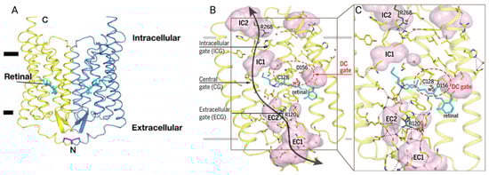First thought to be an H+ conductive channel, ChR1 was expressed in Xenopus laevis oocytes and discovered to be permeable to other cations such as Na+, K+, and Ca2+ []. This multi-ion permeability, though, is much lower than ChR2: in fact, ChR2 has a higher conductance to cations such as Na+, K+, and Ca2+, while ChR1 is mostly H+ permeable. This difference, together with diverse light absorption properties, causes ChR1 to be unsuitable for controlling neuronal excitability because the number of protons that permeate the channel is insufficient to depolarize neurons above the threshold at physiological pH []. As such, ChR2’s biophysical properties have been studied more intensively and genetic modifications and protein engineering have expanded the spectral and kinetic characteristics of the ion channel, enabling more precise control over cellular activity and overcoming the limitations of this already useful optogenetic instrument []. The main structure of ChR2 can be found in Figure 3A. ChR2 is represented as a dimer with the retinal highlighted in blue. Figure 3B shows the ChR2 monomer and its gating system, allowing a clear view of the path the ions should take once the retinal undergoes its physical conformational change due to light irradiation.
