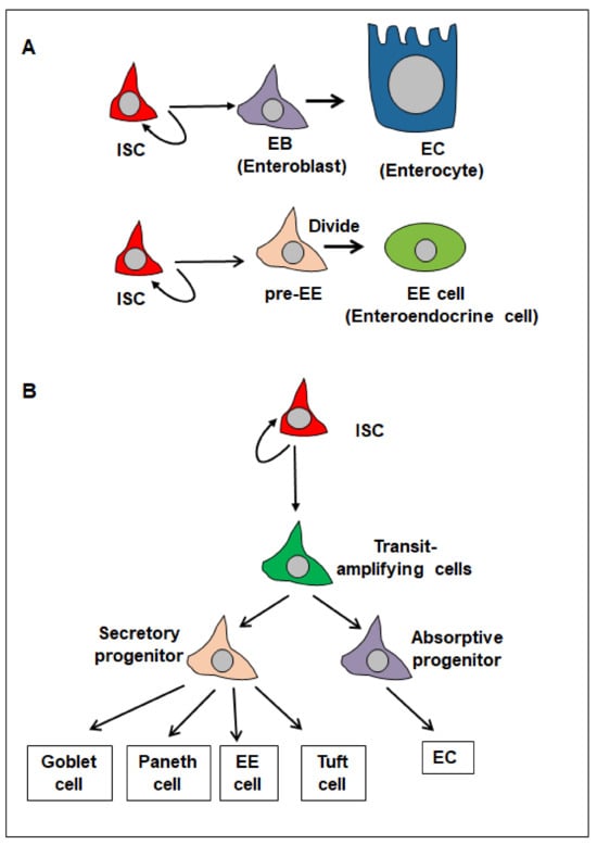During tissue homeostasis in the Drosophila intestine, the resident ISCs can self-renew and differentiate into committed cells (enteroblasts and pre-enteroendocrine cells) and then mature cells (enterocytes and enteroendocrine cells) to replace damaged cells (Figure 1A) [,,]. In response to tissue damage, including injury and infection, ISCs, precursor cells, and mature cells can be damaged. ISCs then become transiently activated, increasing their proliferation and undergoing symmetrical divisions to produce more ISCs [,,,,,,,,,,,,,,,,,,,,,]. In addition, ISC progeny cells can also dedifferentiate to replenish the ISC pool [,,].