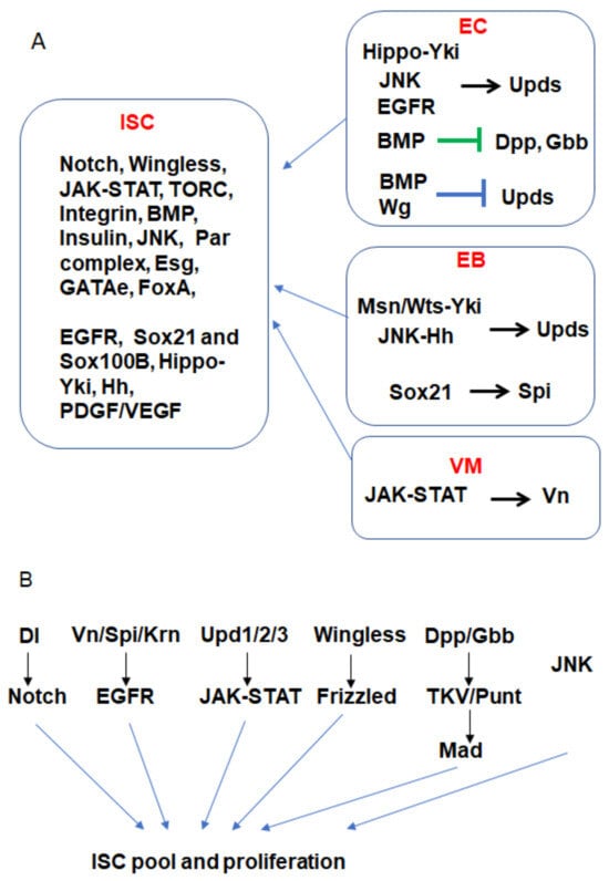 The ISC proliferation is regulated by multiple signaling pathways in Drosophila and mammalian intestines (Figure 2 and Figure 3 and Table 1).