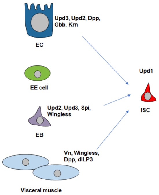 The Janus kinase-signal transducer and activator of transcription (JAK-STAT) pathway also plays a key role in ISC maintenance [,]. In Drosophila, the JAK-STAT pathway is activated by three ligands, Unpaired 1 (Upd1), Unpaired 2 (Upd2), and Unpaired 3 (Upd3), each with distinct functions. Upd1 is produced in precursor cells and is required throughout life to maintain basal turnover of the midgut epithelium by controlling ISC maintenance in an autocrine manner. Upd2 is produced in both precursor cells and mature enterocytes, playing a role in the regular maintenance of the gut. Upd3, on the other hand, is primarily upregulated in mature enterocytes during tissue damage, such as infection or inflammation. Its upregulation contributes to increased ISC proliferation in response to damage [].