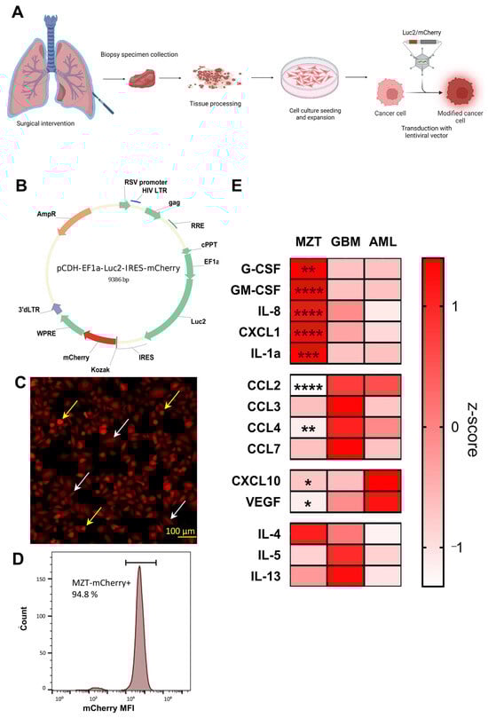Generation and cytokine profiling of primary mesothelioma reporter cell line. (A) Scheme of primary mesothelioma isolation and lentiviral transduction. Primary tumor cells were obtained from a patient’s biopsy with malignant pleural mesothelioma. Tumor mass was dissociated mechanically to generate single-cell suspension. Cells were passaged 15 times and transduced with (B) pCDH-EF1a-Luc2-IRES-mCherry lentiviral vector, encoding reporter proteins—Luc2 and mCherry. (C) Cells in culture displayed elongated spindle-shaped morphology (white arrows) and anchorage-independent growth (anoikis resistance) (yellow arrows) (D) Mean-fluorescence intensity (MFI) of the established primary mesothelioma reporter cell line. (E) 1 × 105 cells were seeded in 96-well plates in 100 μL of medium per well. Supernatants were collected 24 h after cell adhesion. Comparative human cytokine profiling of suspensions of three tumor cell lines: mesothelioma—MZT-Luc2-mCherry (MZT), glioblastoma (GBM), and acute myeloid leukemia (AML) using Z-score. Statistical analysis was performed using two-way analysis of variance (ANOVA). n = 3 samples per group. * for p < 0.05, ** for p < 0.01, *** for p < 0.001, **** for p < 0.0001; Z-score transformed concentration (pg/mL) in medium. Measurements were performed using a multiplex assay on cell culture supernatants.