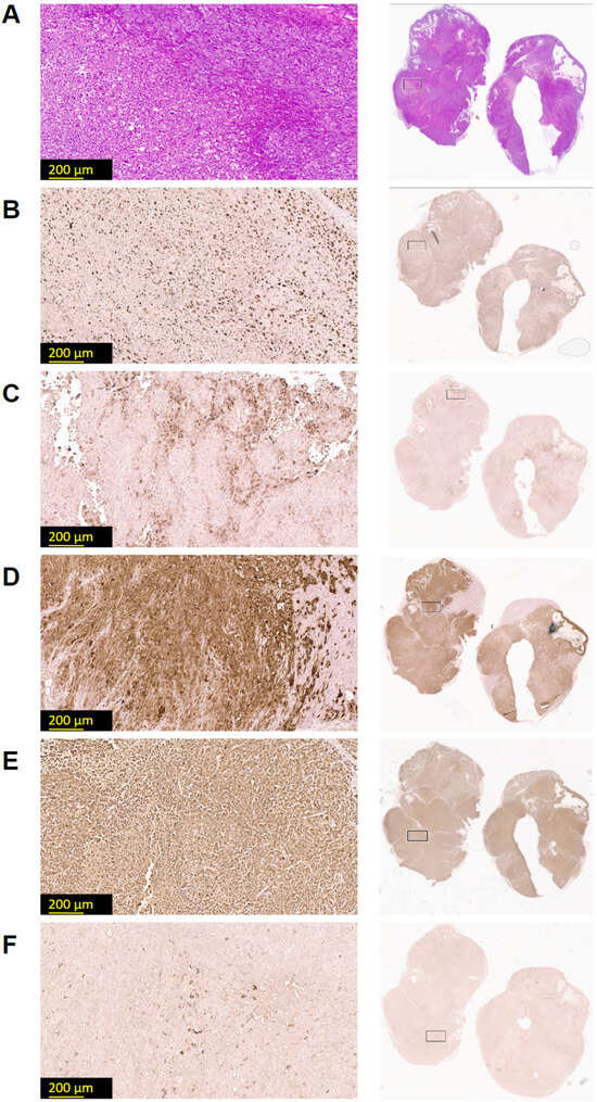 Histology and immunohistochemistry of engrafted mesothelioma. Used stainings: (A) hematoxylin–eosin; (B) Ki-67; (C) Epithelial Membrane Antigen; (D) Calretinin; (E) Pancytokeratin; (F) Mesothelin. Histopathological examination revealed a neoplastic lesion consistent with epithelioid mesothelioma, exhibiting a predominantly solid growth pattern with focal areas of necrosis (n = 4). The images were obtained by Leica Aperio GT450 DX scanner (Leica Biosystems, Deer Park, TX, USA) and then processed at 20× magnification using Aperio ImageScope 12.4.6 software.