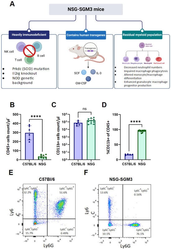 Immunodeficient NSG-SGM3 mice possess residual myeloid populations. (A) Summary of inherent NSG-SGM3 (NOD.Cg-Prkdcscid Il2rgtm1Wjl Tg (CMV-IL3,CSF2,KITLG)1Eav/MloySzJ) mouse strain traits. (B) Comparison of CD45+ cell counts between C57BL/6 and NSG-SGM3 mice. NSG-SGM3 mice show significantly lower CD45+ cell counts per μL (p < 0.0001). (C) Comparison of CD45 + CD11b+ cell counts per μL between C57BL/6 and NSG-SGM3 mice. No significant difference was observed. (D) Comparison of CD11b+ cells as a percentage of CD45+ cells between C57BL/6 and NSG-SGM3 mice. NSG-SGM3 mice exhibit a significantly higher percentage of CD11b+ cells (**** for p < 0.0001). Statistical analysis (B–D) was performed using paired t-test. (E) Representative flow cytometry dot plot of myeloid populations in C57BL/6 mice. (F) Representative flow cytometry dot plot of myeloid populations in NSG-SGM3 mice. Cells (in (E,F)) were gated from VD⁻CD45+CD11b+ population.