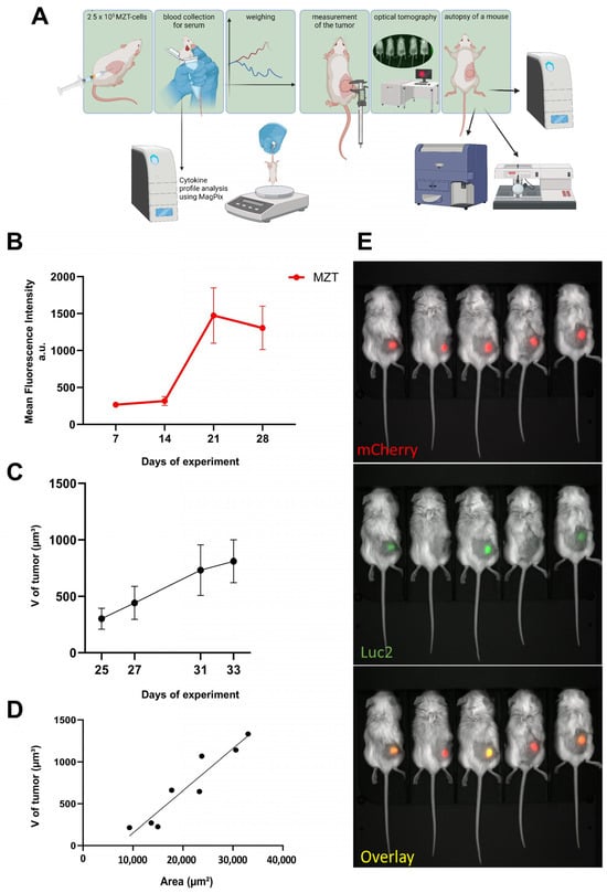 MZT-Luc2-mCherry successful engraftment in NSG-SGM3 mice provides a useful model of tumorigenesis. (A) Schematic representation of the experimental timeline and methods used. (B) Mean fluorescence intensity of the tumors as measured by optical tomography using LumoTrace® FLUO bioimaging system (Abisense, «Sirius» Federal Territory, Russia) over 28 days of tumor growth (n = 17). Data are presented as mean ± SEM and measured in arbitrary units (a.u.). (C) Tumor volume progression as measured by caliper over the course of the experiment (n = 5). Data are presented as mean ± SEM. (D) Correlation between tumor volume measured by caliper and tumor area measured by optical tomography using LumoTrace® FLUO bioimaging system. Correlation analysis performed using Pearson’s correlation coefficient (r). (E) Representative optical tomography images. Top: fluorescence measurement (exposure 1200 ms, binning 1 × 1, LED 590, filter 650-40). Middle: bioluminescence measurement (exposure 10,000 ms, binning 8 × 8, LED 0, no filter). Bottom: overlay image (bright field: exposure 1200 ms, binning 1 × 1, LED white light, no filter).