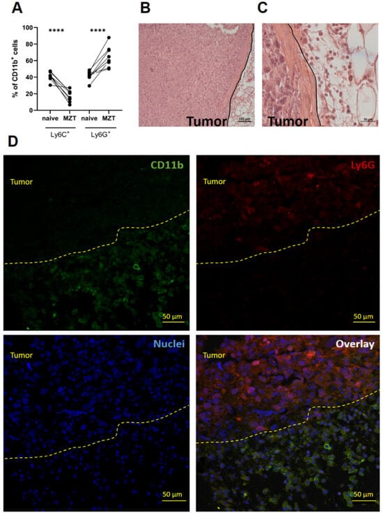 Paired analysis of individual mice before and after tumor implantation demonstrated a consistent shift in these populations (Figure 5A). The significant increase in Ly6G+ cells (p < 0.0001) in the blood is likely due to active proliferation and mobilization of these cells rather than a relative increase caused by the depletion of Ly6C+ cells. Histological examination (Figure 5B,C) suggested an influx of polymorphonuclear cells within the tumor microenvironment and at its periphery, highlighting their critical role in the immune response to the tumor. This was further supported by the observed infiltration of Ly6G+ cells into the tumor tissue (Figure 5D). The expansion of the neutrophil-like population in both the blood and tumor microenvironment suggested a strong neutrophil-driven response to the growing mesothelioma, which aligns with previous reports of neutrophil involvement in mesothelioma progression []. This increase in neutrophil-like cells may contribute to an immunosuppressive microenvironment [,], potentially facilitating tumor growth in the absence of adaptive immune responses. The active proliferation and recruitment of Ly6G+ cells, rather than just a relative increase due to Ly6C+ cell migration, emphasizes the involvement of neutrophils in our model of mesothelioma progression.