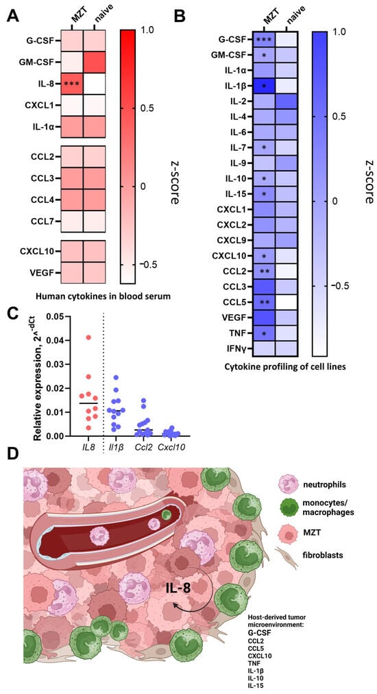 Systemic cytokine production in tumor-bearing mice suggests a cross-talk between engrafted tumor cells and residual myeloid cells in NSG-SGM3 mice. Z-score heatmaps representing cytokine profiles in NSG-SGM3 mice of 2 groups: naïve and 4 weeks after MZT-Luc2-mCherry cell line engraftment. (A) Human and (B) murine cytokine profiles in blood serum. Statistical analysis (A,B) was performed using the Mann–Whitney U test (* for p < 0.05, ** for p < 0.01, *** for p < 0.001). MZT—n = 10, naïve—n = 6; Z-score transformed concentrations (pg/mL) in serum. Measurements were performed using multiplex assay of blood serum samples (A,B). (C) The analysis for inflammatory human (IL8) and murine (Il1b, Ccl2, and Cxcl10) gene expression in the engrafted tumors by real-time PCR. Relative gene expression is shown as a 2^-dCt normalized by human or mouse beta-actin gene, respectively (n = 13). (D) Schematic representation of the complex interplay between mesothelioma tumor cells, tumor microenvironment, and cytokine signaling in NSG-SGM3 mice.