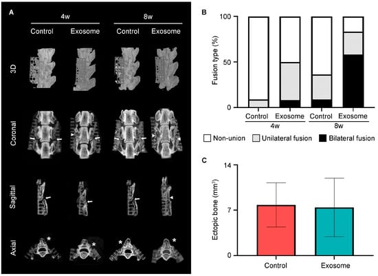 Micro-CT evaluation of spinal fusion at 4 and 8 weeks post-surgery. (A) Representative μ-CT images of reconstructed 3D, coronal, sagittal and axial views of the L3–L5 spinal segment. Clear gaps between the L4 and L5 transverse processes are indicated by white arrows. Successful bony bridges are indicated by white triangles. Ectopic bone is indicated by asterisks. (B) Percentage of rats showing bilateral fusion, unilateral fusion, or non-union. (C) Volume of ectopic bone (mm3) in control and exosome-treated rats at 8 weeks post-surgery. Control group (n = 11). Exosome group (n = 12). Results are presented as mean ± standard deviation.