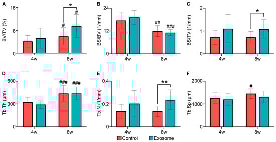 Additionally, the exosome group displayed a general improving trend in the bone structural parameters, with statistically significant improvements in BV/TV (4w: 5.96 ± 3.96% vs. 8w: 10.66 ± 4.56%, p = 0.010), BS/BV (4w: 19.20 ± 3.72/mm vs. 8w: 11.16 ± 1.60/mm, p < 0.001) and Tb.Th (4w: 292 ± 50 µm vs. 8w: 440 ± 84 µm, p < 0.001) from 4 to 8 weeks.