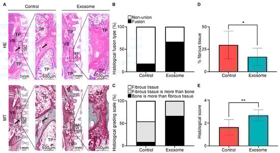 Histological evaluation of spinal fusion at 8 weeks post-surgery. (A) Representative photomicrographs of hematoxylin and eosin (HE) and Masson-Goldner trichrome (MT) stained sections. (B) Histological fusion type, (C) histological grading scale, (D) percentage of fibrous tissue and (E) histological scores comparing the control group (n = 11) and exosome group (n = 12). Histological non-union, presented as fibrous tissue between the L4 and L5 transverse process (TP), are indicated by black arrows. Scale bars indicate 1 mm or 500 µm. Results are presented as mean ± standard deviation. * p < 0.05 and ** p < 0.01 compared to control. VB: vertebral body, SC: scaffold.
