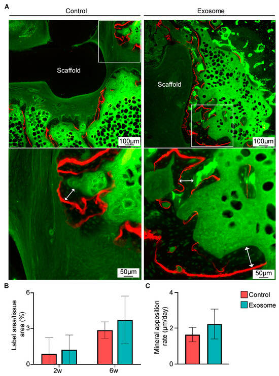 To evaluate the bone formation and bone growth rate, area fractions of new bone tissues and mineral apposition rates were compared between the exosome and control group (Figure 5A–C). There was a greater area fraction of new bone tissue at 2 weeks (1.21 ± 1.23% vs. 0.86 ± 1.36%, p = 0.619) and 6 weeks (3.71 ± 2.02% vs. 2.85 ± 0.70%, p = 0.305) (Figure 5B), and therefore higher mineral apposition rate (2.28 ± 0.81 µm/day vs. 1.67 ± 0.36 µm/day, p = 0.097) (Figure 5C) in the exosome group than in the control group, although these differences were not statistically significant.