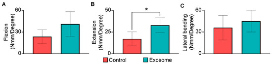 Biomechanical stiffness analysis to assess segmental stability of the operated lumbar spine at 8 weeks. Stiffness in (A) flexion, (B) extension and (C) lateral bending were compared between the control group (n = 4) and exosome group (n = 5). Data are presented as mean ± standard deviation. * p < 0.05 compared to control.