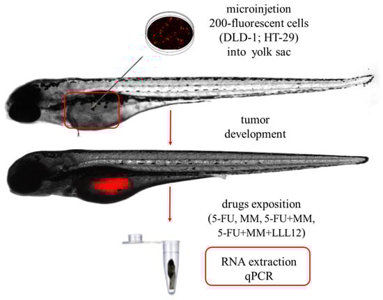 The schematic protocol of zebrafish study. Abbreviations: 5-FU—5-fluorouracil; DLD-1/HT-29—colorectal cell lines; LLL12—STAT-3 inhibitor, MM—MM-129 (pyrazolo[4,3-e]tetrazolo[4,5-b][1,2,4]triazine sulfonamide).