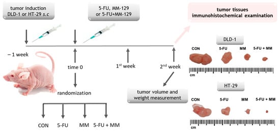 Schematic representation of in vivo experiment from which tissues were obtained for further analysis. Abbreviations: 5-FU—5-fluorouracil; DLD-1/HT-29—colorectal cell lines; MM—MM-129 (pyrazolo[4,3-e]tetrazolo[4,5-b][1,2,4]triazine sulfonamide).