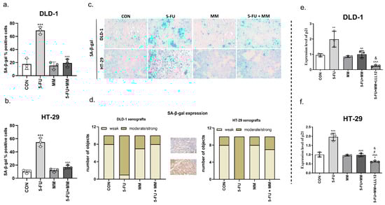 Senescent cells typically exhibit increased lysosomal β-galactosidase activity, detectable as SA-β-gal. Following treatment with 5-FU, both DLD-1 and HT-29 cultures showed a significant rise in SA-β-gal-stained cells relative to the control group (*** p < 0.001 vs. CON). MM-129 reversed the effect induced by 5-FU and dramatically decreased the proportion of SnCs in DLD-1 and HT-29 from 69% to 19% (^^^ p < 0.001 vs. 5-FU) and from 55% to 17% (^^^ p < 0.001 vs. 5-FU), respectively (Figure 3a–c). Compared to the control group, 5-FU-treated cells exhibited blue staining and appeared larger and flatter (Figure 3c). Analysis of SA-β-gal expression in solid tumor tissues revealed moderate/strong expression for SA-β-gal in 90% of DLD-1 xenografts (9/10) and in all HT-29 xenografts (10/10) treated with 5-FU. MM-129 alone did not affect the expression level of this marker compared to control. However, it abolished the effect of 5-FU in the group treated with 5-FU + MM-129 (2/10 in DLD-1 xenografts and 3/10 in HT-29 xenografts) (Figure 3d).