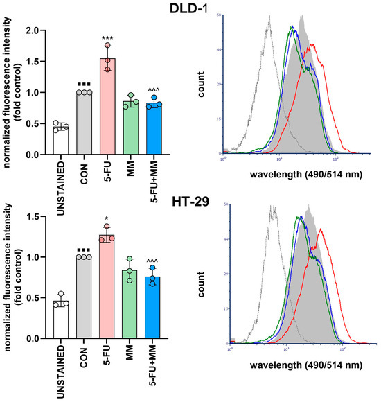 Representative histograms depict β-galactosidase activity in DLD-1 and HT-29 cells after treatment with 5-FU, MM-129, or their combination. Unstained population (UNSTAINED) is shown in white, control in grey, whereas treated groups are marked in red (5-FU), green (MM), and blue (5-FU + MM). Differences in mean fluorescence intensity (MFI) reflect the level of enzymatic hydrolysis. Values represent the mean of three independent experiments (triplicate measurements). * p < 0.05, *** p < 0.001 vs. CON; ^^^ p < 0.001 vs. 5-FU, ▪▪▪ p < 0.001 vs. UNSTAINED. Abbreviations: UNSTAINED—unstained negative control; CON—control; MM—MM-129; 5-FU—5-fluorouracil; MFI—mean fluorescence intensity.