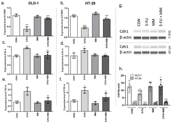 CDH1 (a,b), IL-6 (c,d) and TNF-α mRNA (e,f) levels in DLD-1 and HT-29 cells after treatment with 5-FU, MM-129 (MM), and their combination (5-FU + MM). The results are presented as means ± SDs, n = 6. Cdh1 and β-actin expression as determined by Western Blot (g,h). The values were obtained from three independent experiments performed in duplicate. Images and quantification were obtained by capillary protein separation and immunodetection. * p < 0.05; *** p < 0.001 vs. CON; ^ p < 0.05; ^^ p < 0.01; ^^^ p < 0.001 vs. 5-FU. Abbreviations: CON—control; MM—MM-129; 5-FU—5-fluorouracil.