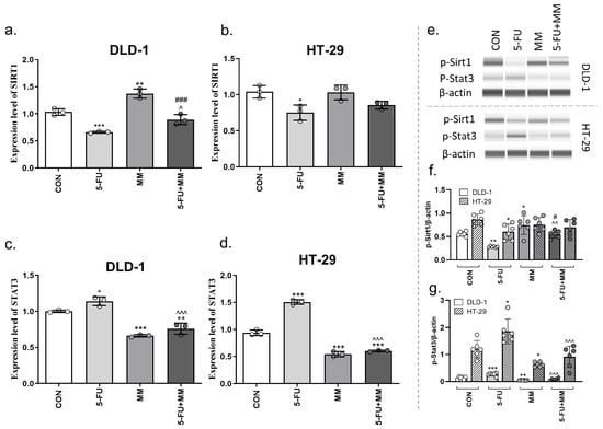 SIRT1 (a,b) and STAT3 (c,d) mRNA levels in DLD-1 and HT-29 cells after incubation with 5-FU, MM-129 (MM) and their combination (5-FU + MM). The results are presented as means ± SDs, n = 6. p-Sirt1, p-Stat3 and β-actin expression as determined by Western Blot (e–g). The values were obtained from three independent experiments performed in duplicate. Images and quantification were obtained by capillary protein separation and immunodetection. * p < 0.05; ** p < 0.01, *** p < 0.001 vs. CON; ^ p < 0.05; ^^ p < 0.01; ^^^ p < 0.001 vs. 5-FU, # p < 0.05; ### p < 0.001 vs. MM-129. Abbreviations: CON—control; MM—MM-129; 5-FU—5-fluorouracil.
