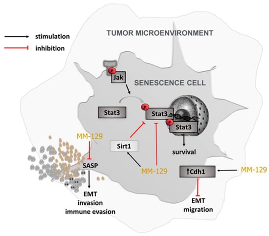 Schematic representation of the potential senotherapeutic actions of MM-129. Abbreviations: Cdh1—E-cadherin, a type I transmembrane protein involved in epithelial adhesion; EMT—epithelial–mesenchymal transition, a process linked to tumor progression; JAK—Janus kinases, intracellular signaling mediators; SASP—senescence-associated secretory phenotype, comprising pro-inflammatory factors secreted by senescent cells; Sirt1—a member of the sirtuin family with roles in metabolism and stress resistance; Stat3—signal transducer and activator of transcription 3, a transcription factor downstream of multiple cytokine pathways.