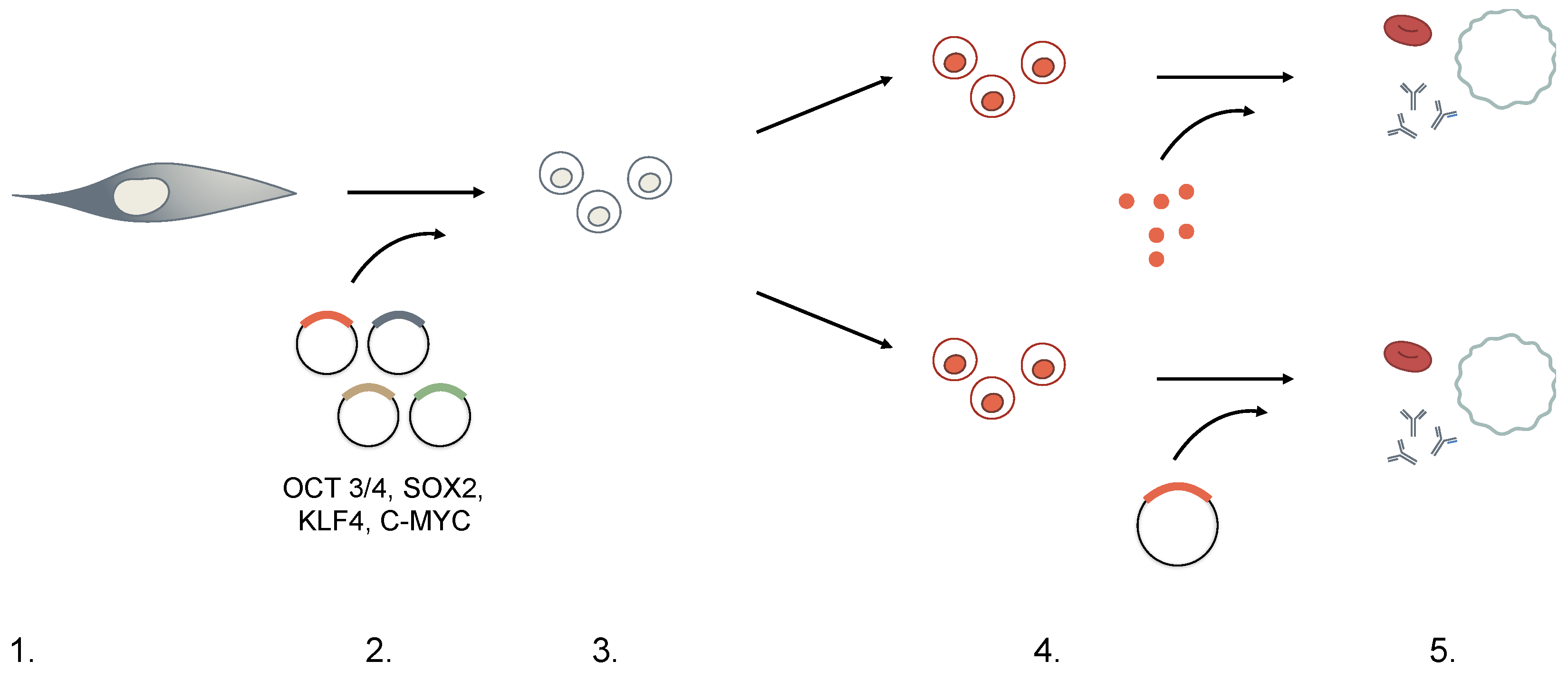 Direct reprogramming was initially performed in mouse fibroblasts through retroviral transduction of 24 candidate genes, all implicated in the establishment and maintenance of the pluripotent state of somatic cells. Identification of these candidates led to the hypothesis that all or some of them could play pivotal roles in the maintenance of ESC identity. Takahashi et al. developed an assay in which the pluripotent state could be detected upon induction of an ESC-specific marker: the Fbx15 gene. The authors generated ESCs with a βgeo knock-in construct (Fbx15βgeo/βgeo whereby ESCs homozygous for the Fbx15βgeo/βgeo were resistant to extremely high concentrations of G418 antibiotic). Somatic cells that had successfully undergone reprogramming showed reactivation of Fbx15 and were resistant to antibiotic selection, whereas somatic cells derived from Fbx15βgeo/βgeo mice were sensitive to a normal concentration of G418 as expected in the absence of the Fbx15 locus. Initially, Takahashi et al. introduced all 24 candidate genes into mouse embryonic fibroblasts (MEFs) derived from Fbx15βgeo/βgeo mice by retroviral transduction. Resistant colonies were observed for 16 days after transduction. The results obtained for the drug-resistant colonies with any single factor indicated that no single candidate gene was sufficient to activate the Fbx15 locus. No colony-formation was observed in the absence of Oct3/4 or Klf4. Removal of Sox2 resulted in only a few colonies whereas the lack of c-Myc led to G418-resistant colonies with a flatter, non-ESC-like morphology. The remaining factors did not show to be necessary for colony formation. Overall, these results indicated that Oct3/4, Klf4, Sox2, and c-Myc were the master regulators for the generation of iPSCs. Surprisingly, the authors demonstrated that Nanog was dispensable and later the four factors were demonstrated to work across a multitude of murine cell types [16], as well as rhesus monkey [13] and human [15,17,18] cells.