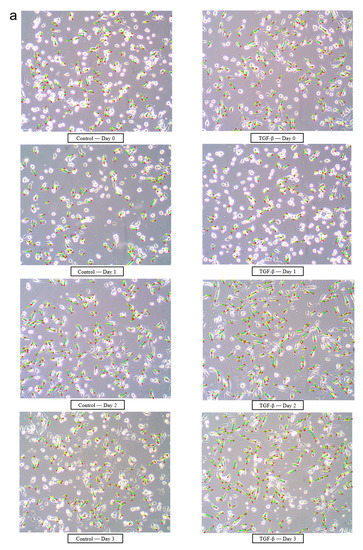 We calculated all the lengths of the detected lines in every group in the time series and plotted them as scatters in Figure 6a. The scatters show many more lines, distributed at a range of high length values in the TGF-β group on days 2 and 3. In detail, the percentage of lines with more than 40 pixels in the TGF-β—Day 2 group was 20%, which was higher than that in the Control—Day 2 group (6%). Fifty-three percent of the lines in the Control—Day 2 group had fairly small lengths (20–25); these were also smaller than in the TGF-β—Day 2 group. The above results indicated that the shape of cells significantly changed with or without treatment, which confirmed our expectation that the long and narrow cells in TGF-β had an obvious linear characteristic. We also compared the detected line lengths among the different treatments on days 2 and 3 (Figure 6b,c). This suggested that the lengths of the three groups (LPS 100 ng/mL, 1% CSE, and 2% CSE) were shorter than those of the control group on day 2, whereas the TGF-β group’s lengths were the longest among all the groups. The above results had a similar tendency as the cell index obtained from the RTCA SP system (Figure 4). The number of lines detected represented the number of cells, which is a vital parameter for identifying the proliferation of cells, as shown in Figure 6d. Our results illustrated that, after the stimulation with TGF-β, the cell number increased sharply compared to the control group until day 2, and in the next 24 h, the number gradually decreased. In conclusion, the TGF-β-induced EMT process in A549 cells could be quantified as a conspicuous change in cell length and cell quantity using image processing techniques, which supplemented the results of the RTCA system and helped us to understand the details of the cell index curve.