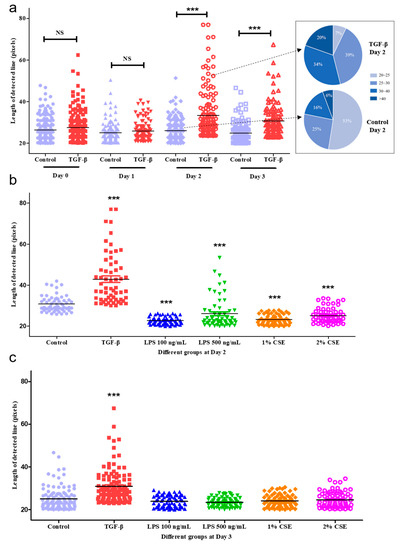 The quantification of the length and quantity of detected lines. (a) A scatter dot plot of the length of the detected lines between the control and TGF-β groups. Pie charts represent the percentages of different length levels on day 2: 20–25, 25–30, 30–40, and >40 pixels. (b) A scatter dot plot comparing the six different groups (control; TGF-β; LPS 100 ng/mL and 500 ng/mL; 1% and 2% CSE groups) on day 2. (c) A scatter dot comparing the six different treatments on day 3. (d) A line graph focused on the number of lines detected from day 0 to 3 in the six groups. n = 3. *** p < 0.001, ** p < 0.01 vs. control group in different time points. ### p < 0.001, ## p < 0.01, # p < 0.05 Day 1 vs. Day 2. $$ p < 0.01, $ p < 0.05 Day 2 vs. Day 3. &&& p < 0.001 vs. TGF-β group in different time points.