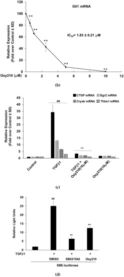Having had identified the Hh pathway inhibitory effects of Oxy16 and Oxy186 [22,23], we examined the effects of Oxy210 on Hh signaling in NIH3T3-E1 mouse fibroblastic cells treated with CAPAN-1 conditioned medium (CM) that we previously reported to contain Hh ligands [22] and found that Oxy210 robustly inhibited the mRNA expression of ligand-induced Hh target genes Gli1 and Ptch1 (Figure 4a). Oxy210 exhibited strong inhibitory effects comparable to established Gli1 inhibitors, such as HPI-1 (10 μM) and Gant61 (20 μM), with an IC50 for inhibition of Gli1 expression of 1.83 ± 0.21 μM (Figure 4b). Interestingly, in addition to inhibiting Hh signaling, Oxy210 strongly inhibited TGFβ signaling in NIH3T3-E1 cells, as evidenced by the inhibition of the expression of TGFβ target genes, including Connective Tissue Growth Factor (CTGF), Early Growth Response 2 (Egr2), thrombospondin-1 (Thbs1) and crystallin, alpha B (Cryab) (Figure 4c). To further validate the inhibitory effect of Oxy210 on TGFβ signaling, we performed a luciferase reporter assay and found that Oxy210 and SB431542, an established TGFβ signaling inhibitor, significantly inhibited the TGFβ induced activity of SBE-luciferase reporter that is responsive to Smads in NIH3T3-E1 cells (Figure 4d).