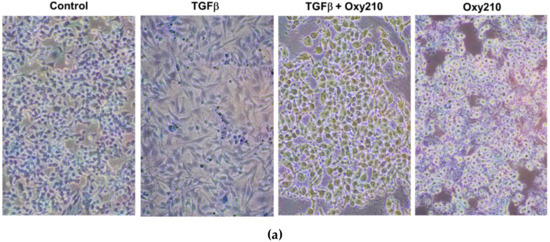 Effect of Oxy210 on inhibition of TGFβ receptors I and II kinase activity was assessed by Eurofins (Celle-L’Evescault, France). TGFBR1 (h): Human TGFBR1 (amino acid 200 to end) was incubated with 8 mM MOPS pH 7.0, 0.2 mM EDTA, 1 mM MnCl2, 2 mg/mL casein, 10 mM Magnesium acetate and [9-33P]-ATP (specific activity and concentration as required). The reaction was initiated by the addition of the Mg/ATP mix. After incubation for 40 min at room temperature, the reaction was stopped by the addition of phosphoric acid to a concentration of 0.5%. 10 μL of the reaction was then spotted onto a P30 filtermat and washed four times for 4 min in 0.425% phosphoric acid and once in methanol prior to drying and scintillation counting. TGFBR2 (h): Human TGFBR2 (amino acid 188-end) was incubated with 20 mM Tris/HCl pH 8.5, 0.2 mM EDTA, 0.33 mg/mL MBP, 10 mM Magnesium acetate and [9-33P-ATP] (specific activity and concentration as required). The reaction was initiated by the addition of the Mg/ATP mix. After incubation for 120 min at room temperature, the reaction was stopped by the addition of phosphoric acid to a concentration of 0.5%. 10 μL of the stopped reaction was spotted onto a P30 filtermat and washed four times for 4 min in 0.425% phosphoric acid and once in methanol prior to drying and scintillation counting [29].