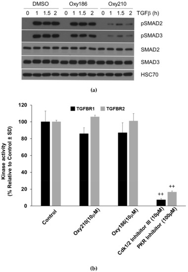 Upon binding TGFβ ligand, TGFβ type II receptor (TβRII), phosphorylates the TGFβ type I receptor (TβRI) that subsequently phosphorylates and activates downstream signal transducers called receptor-regulated Smads (R-Smads). R-Smad phosphorylation state determines Smad complex assembly/disassembly, nuclear import/export, transcriptional activity and stability, and is thus the most critical event in TGFβ signaling [38]. Smad2 and Smad3 are members of R-Smad that are phosphorylated and activated upon activation of TβRII and TβRI. We investigated if Oxy210 inhibits TGFβ signaling via inhibiting TGFβ-induced phosphorylation of Smad2 and Smad3. As shown in Figure 11a, TGFβ- induced phosphorylation of Smad2 and Smad3 was robustly inhibited by Oxy210 but not Oxy186 in A549 cells. Using Oxy186 as a negative control, we next investigated whether Oxy210 can inhibit the activity of TβRII and TβRI in functional kinase assays [29]. Surprisingly, Oxy210 (nor Oxy186) did not display significant inhibitory activity in these assays compared to Cdk1/2 Inhibitor III and PKR Inhibitor used as positive controls (Figure 11b). This suggests that, unlike SB431542 and clinical candidate galunisertib [39,40], Oxy210 does not act as a kinase inhibitor of TβRI or TβRII. We then investigated if Oxy210 inhibits the activity of TβRI using a luciferase reporter assay. R1BL17 cells, a mink lung epithelial cell line that does not express TβRI, were transiently transfected with a Smad responsive luciferase reporter and a vector (LPCX) expressing TβRI (RI) or expressing a constitutively active version of TβRI (RI_TD) or an empty LPCX and then treated with TGFβ in the presence of Oxy210 or Oxy186. As shown in Figure 11c, the activity of the reporter stimulated by either TGFβ-activated RI or ligand independent RI_TD was significantly inhibited by Oxy210 but not Oxy186, suggesting that Oxy210 acts at the level of activated TβRI and the Smad2/3 interaction.