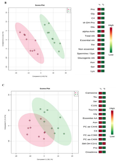 For metabolomics analysis, two separate analytical methods were employed to identify discriminant metabolites—multivariate and univariate analyses. These analyses were performed using MetaboAnalyst v4.0 (http://www.metaboanalyst.ca). The classification method was based on partial least squares discriminant analysis (PLS-DA). Values of variable importance in projection [20] represent the importance of the metabolite for the PLS-DA models. The score scatter plots show the classified samples, and the loading plot characterizes the relation between the Y and X variables. For each analysis, the standard, default parameters of MetaboAnalyst were applied. The univariate analysis of metabolite levels was based on the fold-change (FC) values and the threshold of significance (p < 0.1) after a non-parametric Wilcoxon test (volcano plot), while the multivariate analysis of metabolites depended on the accuracy of the variable importance in the projection (VIP). Therefore, the metabolites that had VIP values > 1 of the multivariate analyses and those that were determined by an FC > 2 (for each comparison) with p < 0.1 of the univariate analyses were retained as the most relevant for further discussion [21,22].