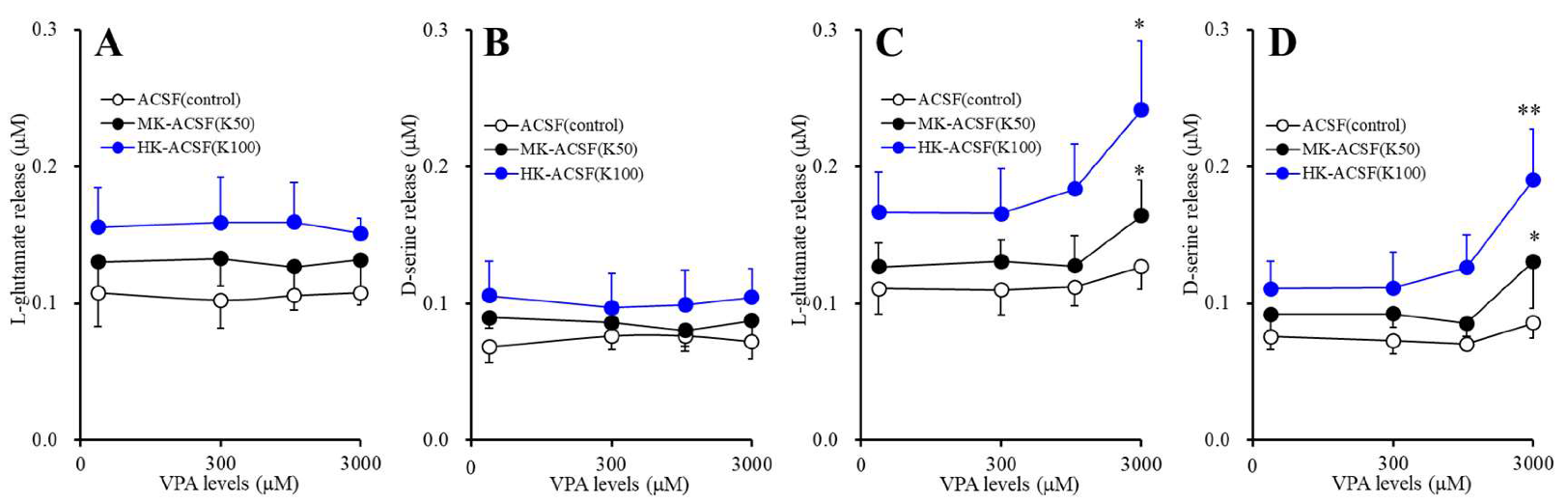 2.3.3. Concentration-Dependent Effects of Acute and Subchronic Administration of VPA on Astroglial Releases of l-glutamate and d-serine (Study_3)