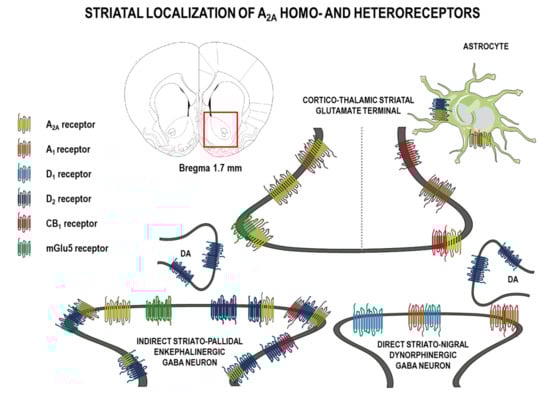 A1-A2Aisoreceptor complexes were identified in striatal glutamate nerve terminals at the presynaptic level []. On striatal glutamate nerve terminals, there may also exist A2A-D2 heterodimers in balance with A1-A2A-D2 trimeric heteroreceptor complexes.